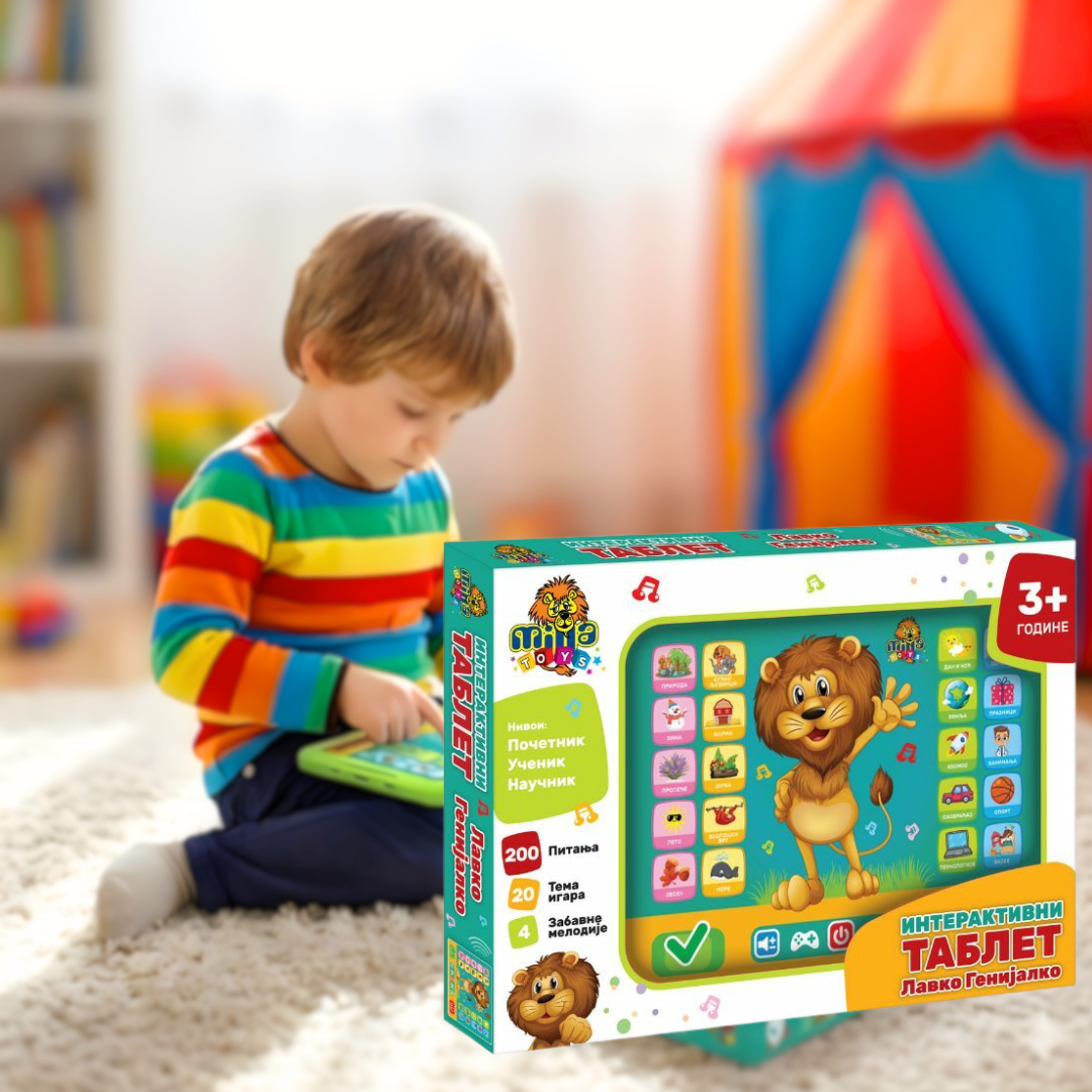 Znaš onaj trenutak kad dete uzme telefon ili tablet, ti mu daš samo da bude mirno, a u glavi ti se vrti pitanje: „Da li ovo uopšte ima neku korist?“ Upravo tu nastaje problem – deca vole ekrane, ali roditelji žele da to vreme donese i nešto dobro. Zato je tu Interaktivni tablet Lavko Genijalko. Ovo nije obična igračka. Ovo je tablet napravljen baš za decu od 3 godine naviše, koji kroz igru uči slova, brojeve, boje, oblike, životinje i još mnogo toga. Dete misli da se igra, a ti znaš da zapravo uči. Nema interneta, nema reklama, nema slučajnih sadržaja. Samo ono što je prilagođeno njegovom uzrastu. Ako želiš da tvoje dete provodi vreme pametnije, a da se pritom raduje kao da je dobilo novu omiljenu igračku – Lavko Genijalko je napravljen baš za to.