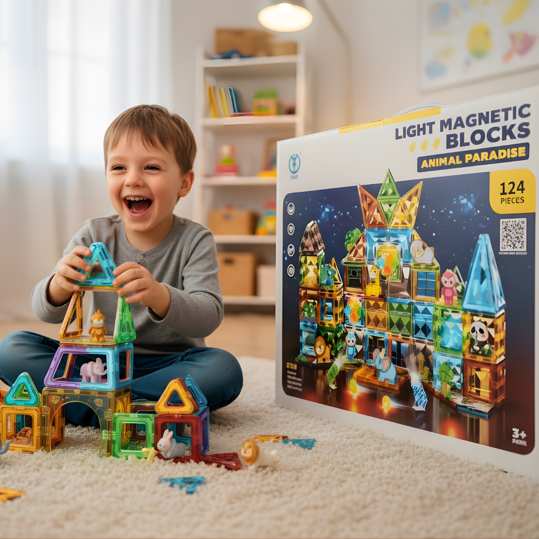 Ono što ove kocke izdvaja od običnih magnetnih blokova su svetleći delovi i 4D dijamantska površina. Kada dete ugasi svetlo u sobi i vidi kako se građevina blago osvetli, doživi nešto novo i zanimljivo. Nije to “čudo”, već jednostavno lep efekat koji čini da dete bude ponosno na ono što je napravilo. Svetlo daje dodatnu motivaciju da gradi još veće i bolje. Uz to, providni i sjajni delovi lome svetlost i čine da građevina izgleda bogatije i življe. Za roditelje je to još jedan način da dete zadrži pažnju na igri bez ekrana. Umesto da gleda crtani, dete gleda svoju građevinu koja svetli jer ju je samo napravilo. To je velika razlika.